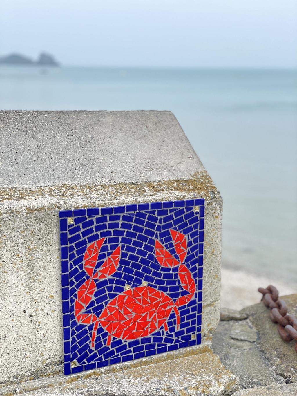 Découvrez une mosaïque représentant un crabe, installée sur le port de Cancale, en Bretagne (Ille-et-Vilaine) ! Cette création colorée rend hommage au littoral breton et à l'univers marin de Cancale, célèbre pour ses huîtres et ses paysages exceptionnels.